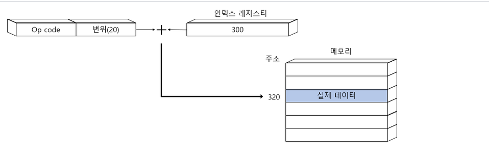 - 변위 주소지정 방식으로 오퍼랜드의 주소와 인덱스 레지스터의 벼용을 더하여 유효 주소를 결정한다.