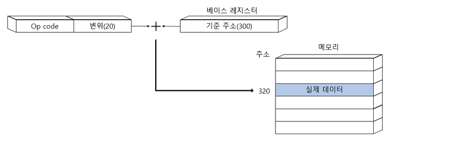 - 변위 주소 지정방식으로 오퍼랜드의 주소와 베이스 레지스터의 내용을 더해서 유효 주소를 결정한다.