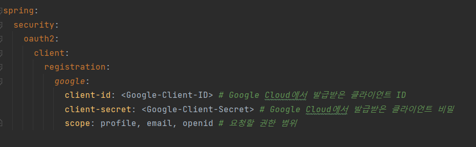 - spring.security.oauth2.client.registration.google: 이 섹션은 Google OAuth2 인증을 위한 설정입니다.