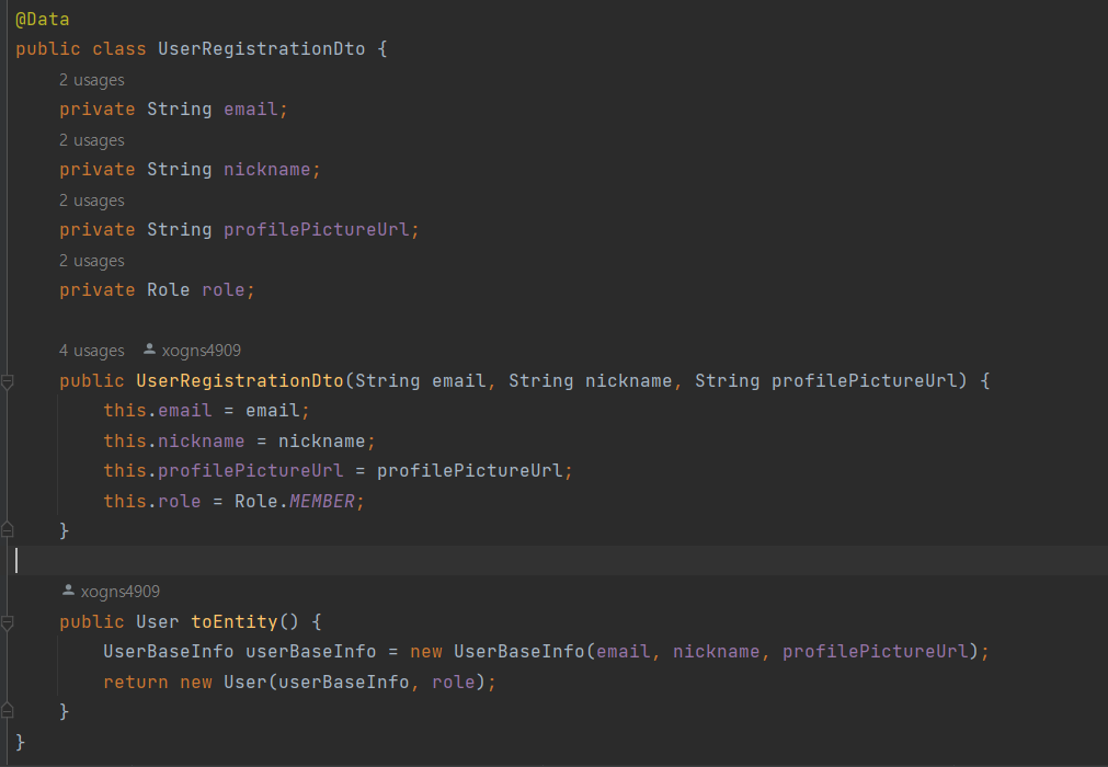 UserRegistDto : 사용자 등록시에 사용되는 GoogleInfoDto에서 변환되며 확장과 유지보수에 용이하도록 한번 더 분리했습니다.
