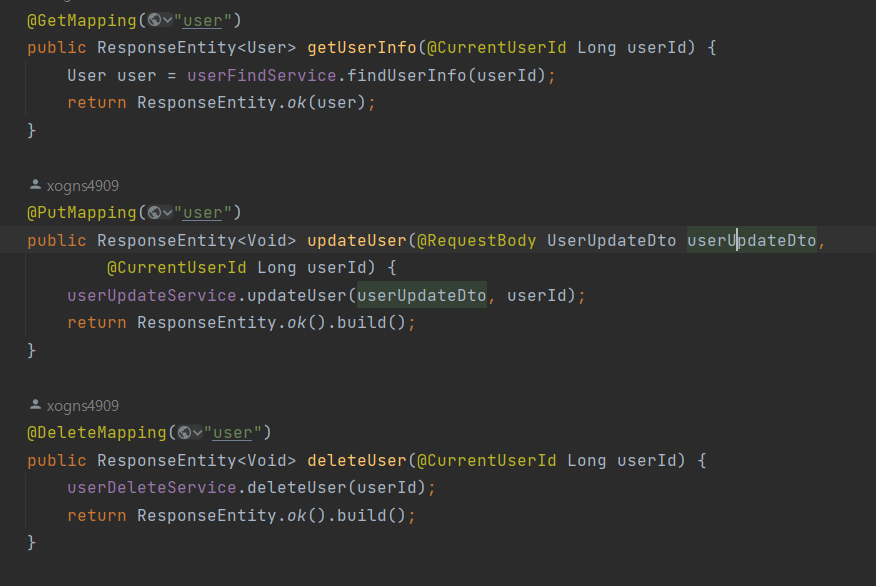 - @CurrentUserId 어노테이션: SecurityContext에 저장된 인증 정보를 쉽게 접근할 수 있도록 커스텀 어노테이션을 생성하고, 이를 컨트롤러의 매개변수에 적용하여 사용자 ID를 직접적으로 얻을 수 있습니다.