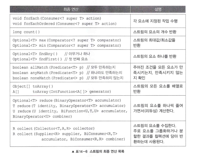 최종 연산 : 연산 결과가 스트림이 아닌 연산 스트림의 요초를 소모하므로 단 한번만 가능