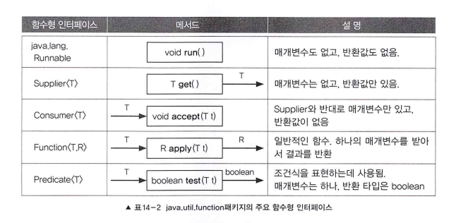 java.util.function 패키지에 일반적으로 자주 쓰이는 형식의 메서드를 함수형 인터페이스로 미리 정의해 두어서 매번 새로운 함수형 인터페이스를 정의하지 말고, 가능하면 이 패키지의 인터페이스를 활용하는 것이 좋다