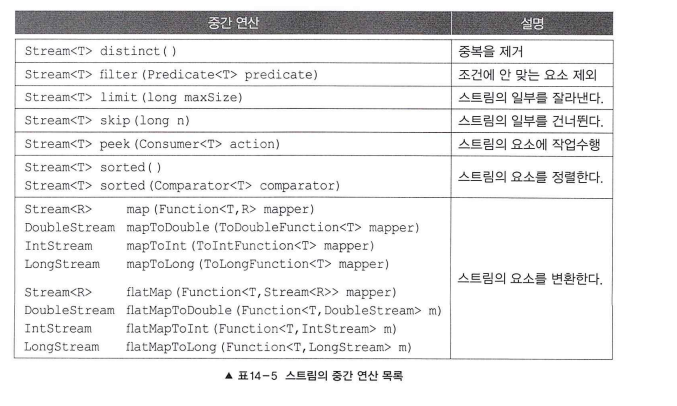 중간 연산 : 연산 결과가 스트림인 연산, 스트림에 연속해서 중간 연산을 할 수 있음