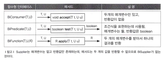 매개변수가 두 개인 함수형 인터페이스는 접두사 'Bi'가 붙는다