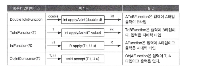 지금까지 소개한 함수형 인터페이스는 기본형 타입의 값을 처리할 때도 래퍼 클래스를 사용해왔다. 그러나 기본형 대신 래퍼클래스를 사용하는 것은 비효율 적이기 때문에 아래와 같은 기본형을 사용하는 인터페이스들이 제공된다.