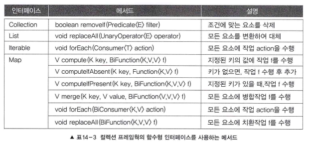 컬렉션 프레임웍의 인터페이스에 다수의 디폴트 메서드가 푸가되었는데, 그중 일부는 함수형 인터페이스를 사용한다.